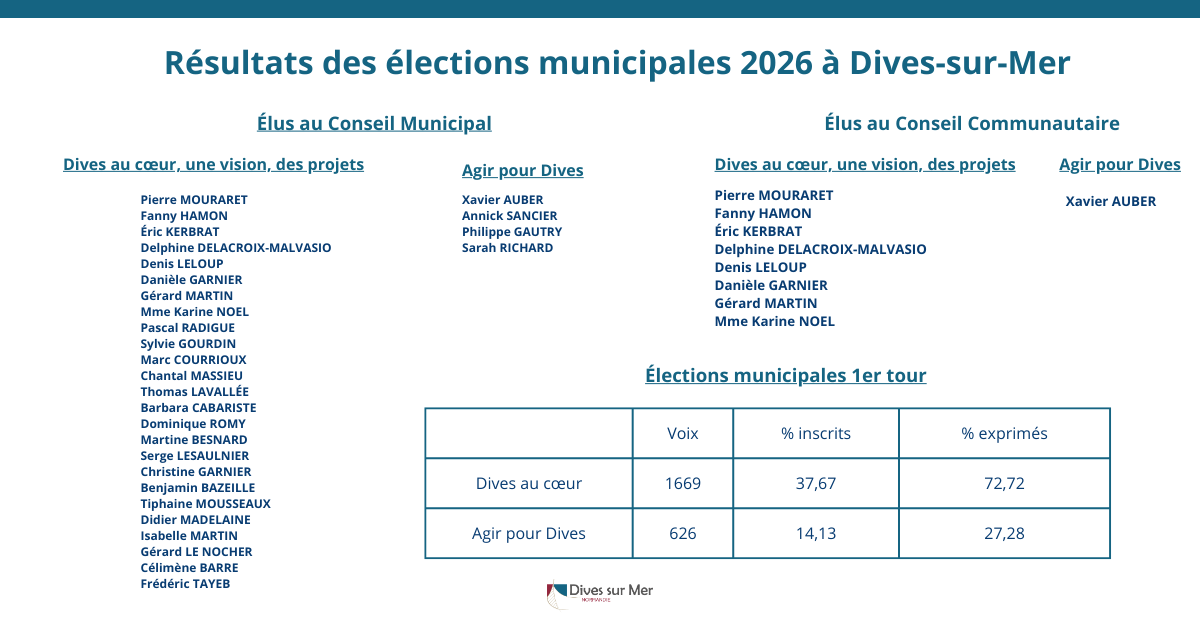 La liste menée par Pierre Mouraret « Dives au cœur » remporte les élections municipales 2026 avec 72,72% des suffrages exprimés.